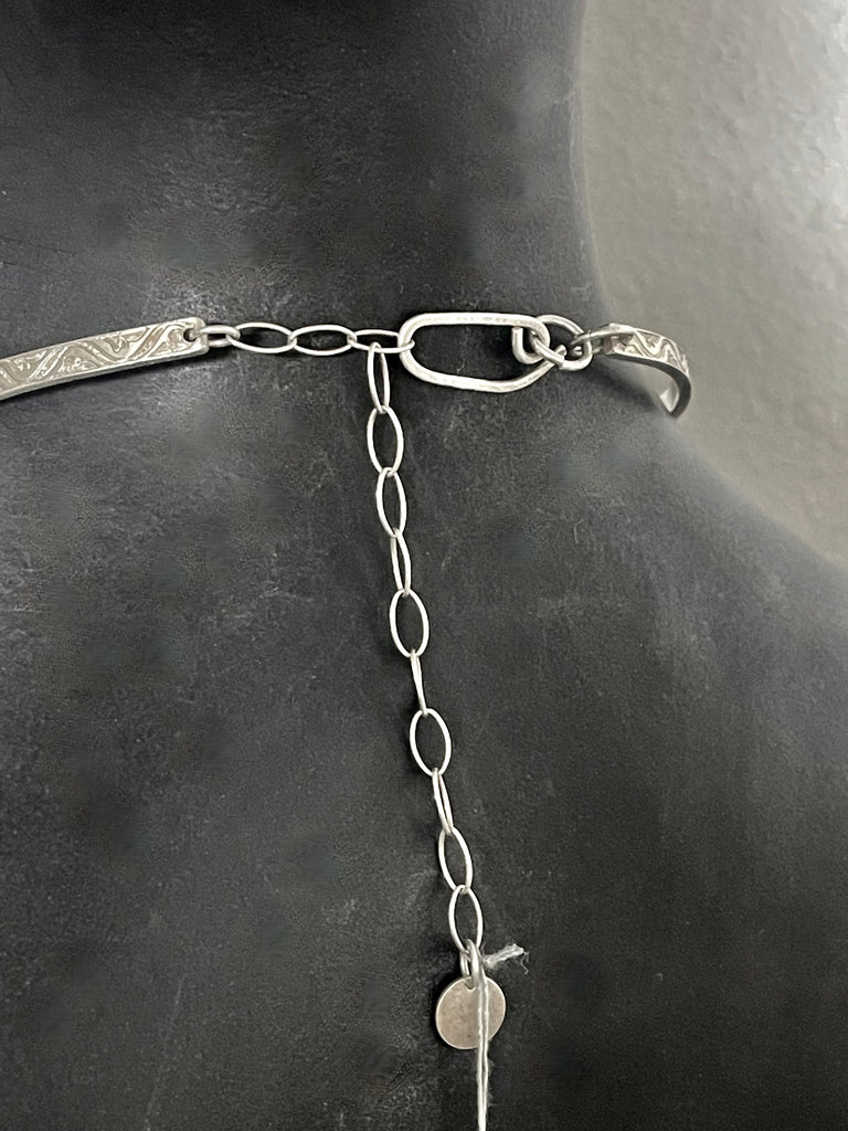 grey, black, terra cotta and tan tone anasazi pottery shard necklace. individual shards suspended from handmade sterling silver band. the edges of the shards are smoothed and polished. the surface locked in with a skin friendly coating. click on anasazi pottery shard for more details about the shards.